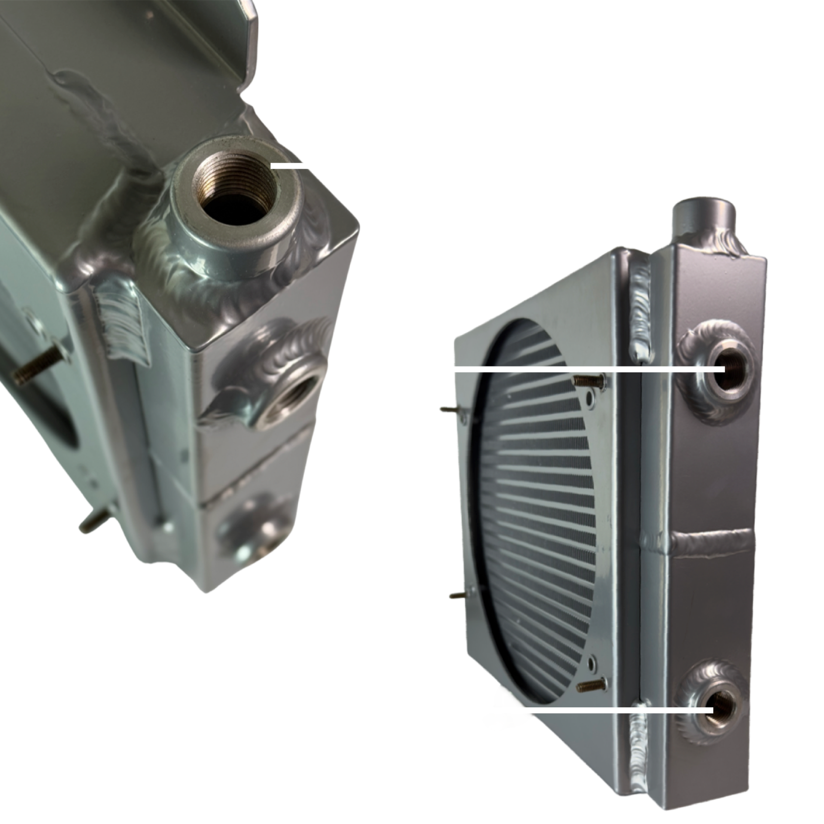 Crafted from aerospace-grade aluminum, this cooler stands as a testament to durability and precision. Each unit is equipped with (3) 1/2” NPT fittings, allowing for secure and versatile installations. For those seeking ultimate cooling capability, Fluidyne offers two fan options: the Spal 11” fan with 932 CFM or the larger Spal fan delivering 1,375 CFM.